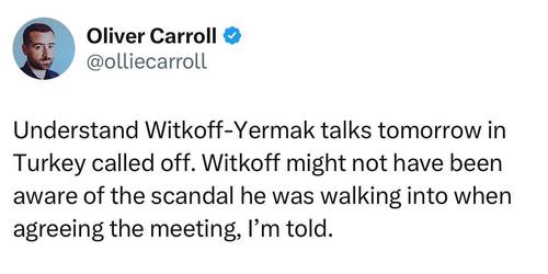 Запланированные в Турции переговоры между Стивом Уиткоффом и Андреем Ермаком отменены на фоне украинского коррупционного скандала